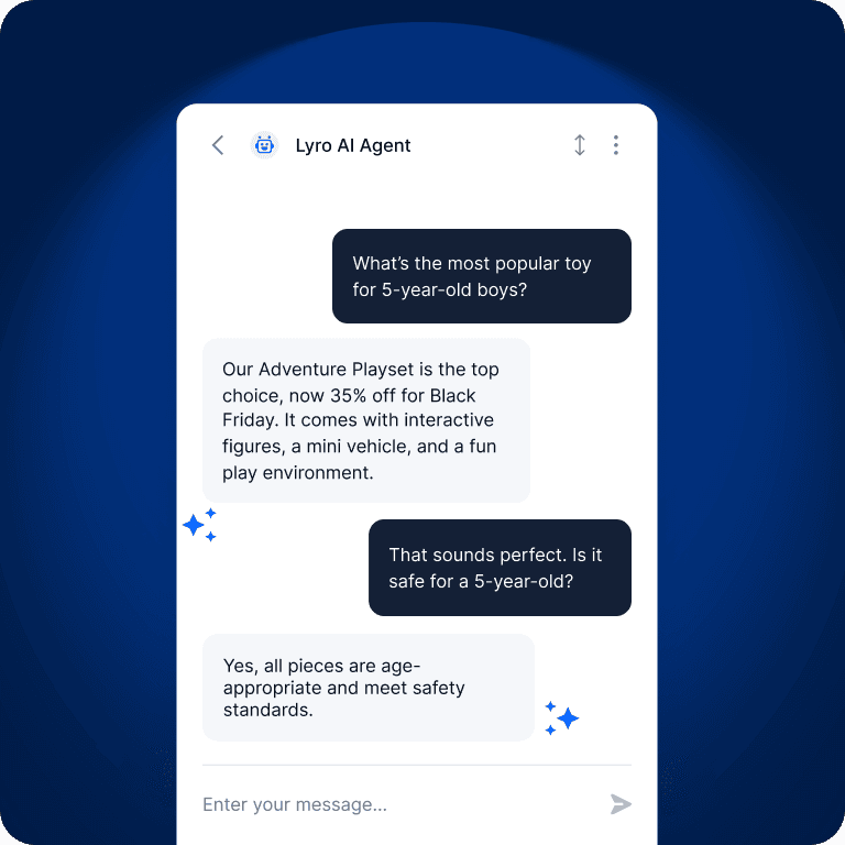 Beyond replies, Lyro can edit orders, book meetings, update customer data, and recommend products — making him a true teammate.