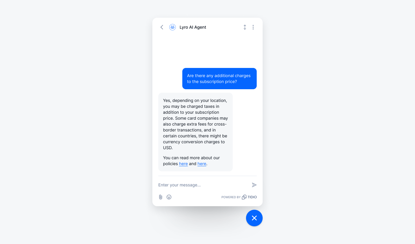 Example: When a visitor asks, “How do I cancel my subscription?”, Lyro immediately provides a clear, step-by-step guide, with no need to escalate unless the user requests it. And it can be trained to use specific emotions and language while doing so.