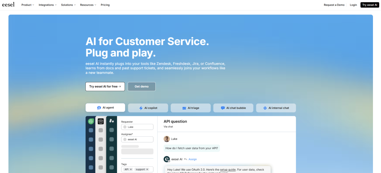 eesel AI is an AI platform made to integrate with your existing tools. It adds a layer to your internal chat, helpdesk, and knowledge sources. Because of its “bring your own helpdesk” design, it’s an excellent option for businesses looking for strong AI without a difficult migration process.