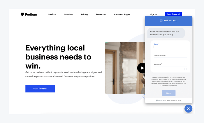 It’s usually text-based, but companies can implement voice-based chatting on their website as an additional feature. The chat widget is placed in the corner of the page and allows shoppers to start a conversation with your business.
