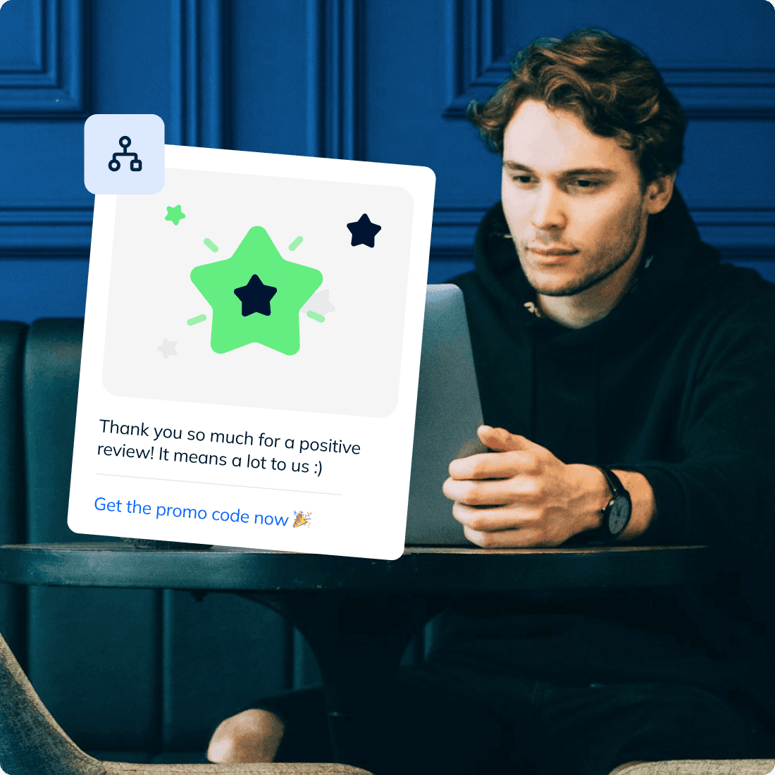 Zmień jednorazowych kupujących w stałych klientów dzięki automatycznym kuponom na kolejne zamówienia. Automatycznie nawiąż kontakt z zadowolonymi klientami, gdy zostawią pozytywne recenzje, i wyślij im kody rabatowe, aby zwiększyć lojalność.